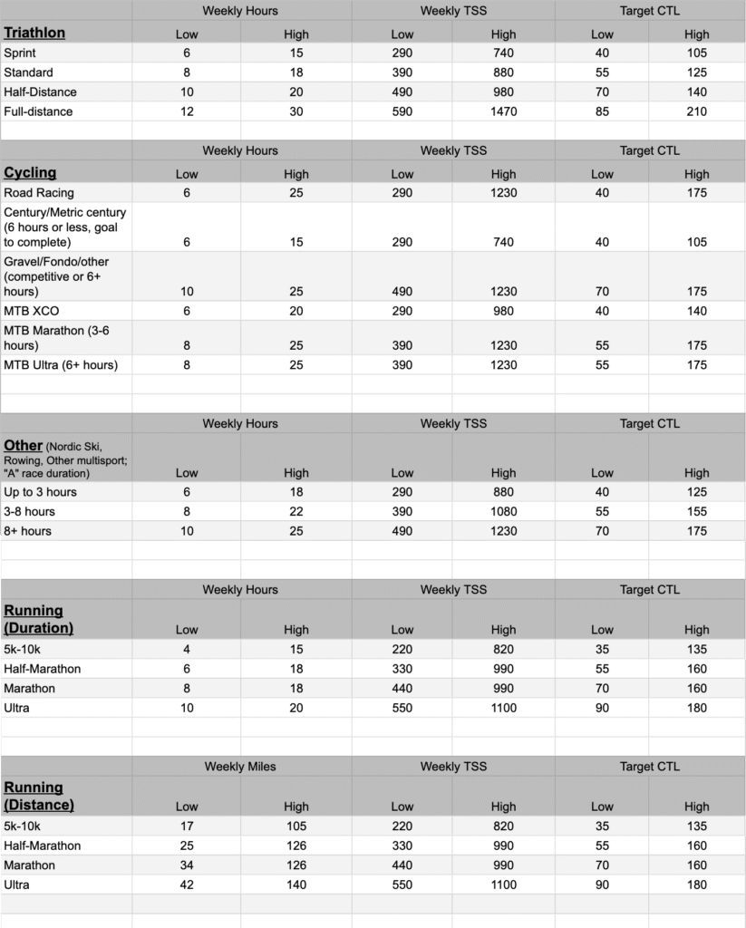 In this chart you can see there are ranges for the weekly hours needed to train for a given distance race.